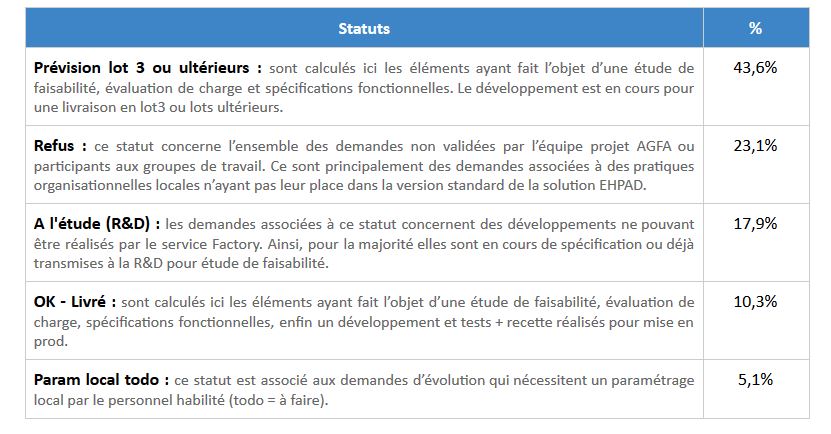 En synthèse, ci-dessous les principales évolutions par domaine et statuts des évolutions venues compléter la solution EHPAD ce premier semestre 2019 et prévisionnel pour fin 2019.